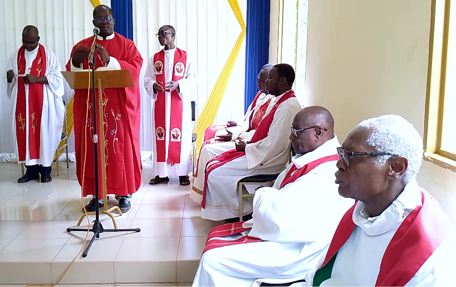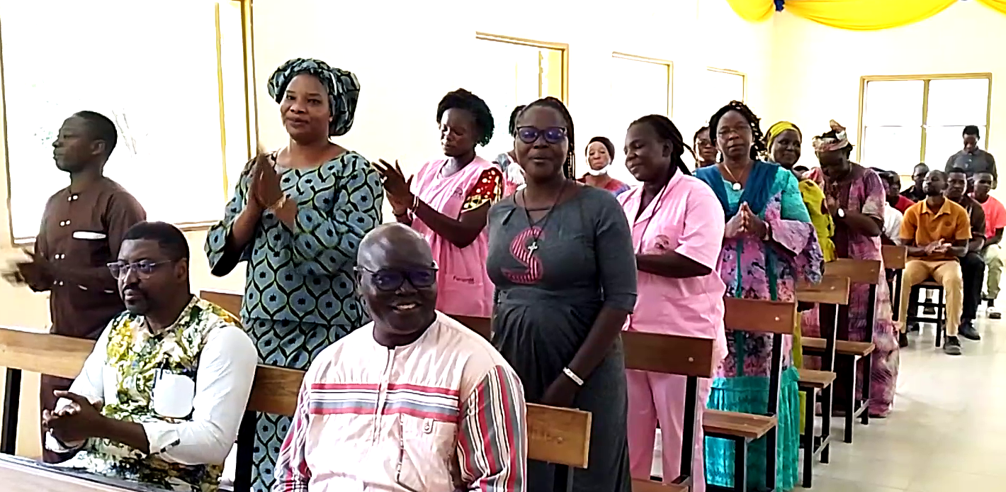 L’Abbé Benjamin qui arrive avait déjà fait quelques stages ici ; il connait l’environnement, mais il vient à présent découvrir la charge du travail et affronter les vrais problèmes. Je lui souhaite à lui et à l’Abbé ALADE de travailler dans la fraternité avec le Directeur général et tous les autres directeurs et responsables dans cet hôpital… s’il y a plusieurs postes, c’est parce qu’une seule personne n’est pas capable de tout faire ; nombreux, et uni, l’on est fort, ce qui peut aboutir à de bons résultats. Je souhaiterais donc que le Directeur Général puisse les accueillir à bras ouverts et souhaiter qu’ils viennent avec un bon cœur. Rassembler toutes les forces, et prier peut aider véritablement à aboutir aux résultats attendus. Il faut que les personnes qui viennent dans cet hôpital puissent en ressortir heureux parce qu’on se serait bien occupé d’eux. C’est ce qu’attend un patient… »