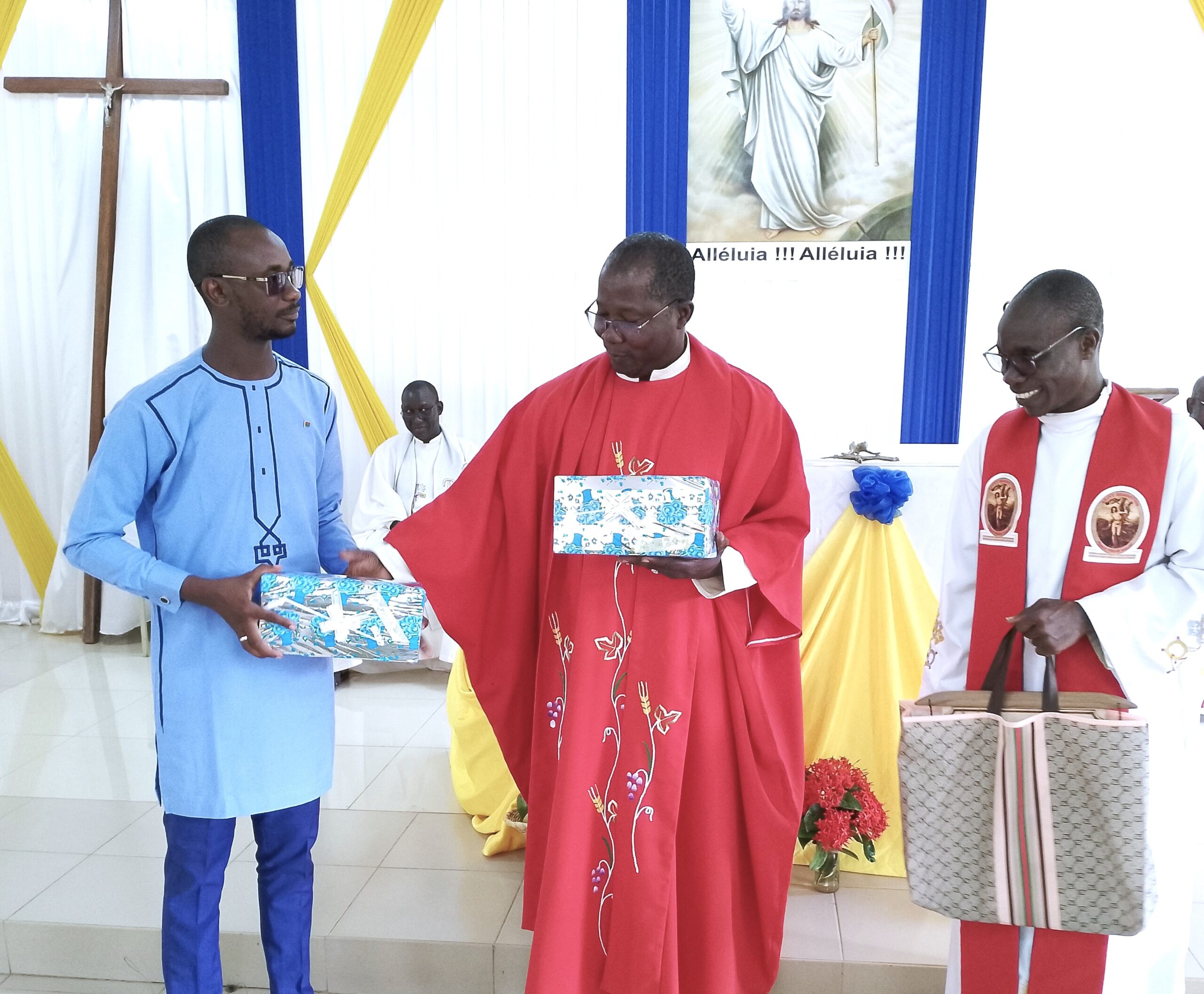 Des présents leur ont été remis après la messe dans une atmosphère quelque peu joviale inspirée du prêtre à l’humeur bon enfant contagieuse, notamment, l’Abbé Jean DOUAMBA. Celui – ci cède son poste à l’Abbé Yann ALADE tandis que l’Abbé Romaric OUEDRAOGO trouve un remplaçant en la personne de l’Abbé Benjamin ILBOUDO.