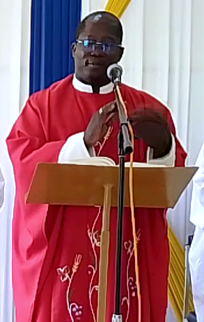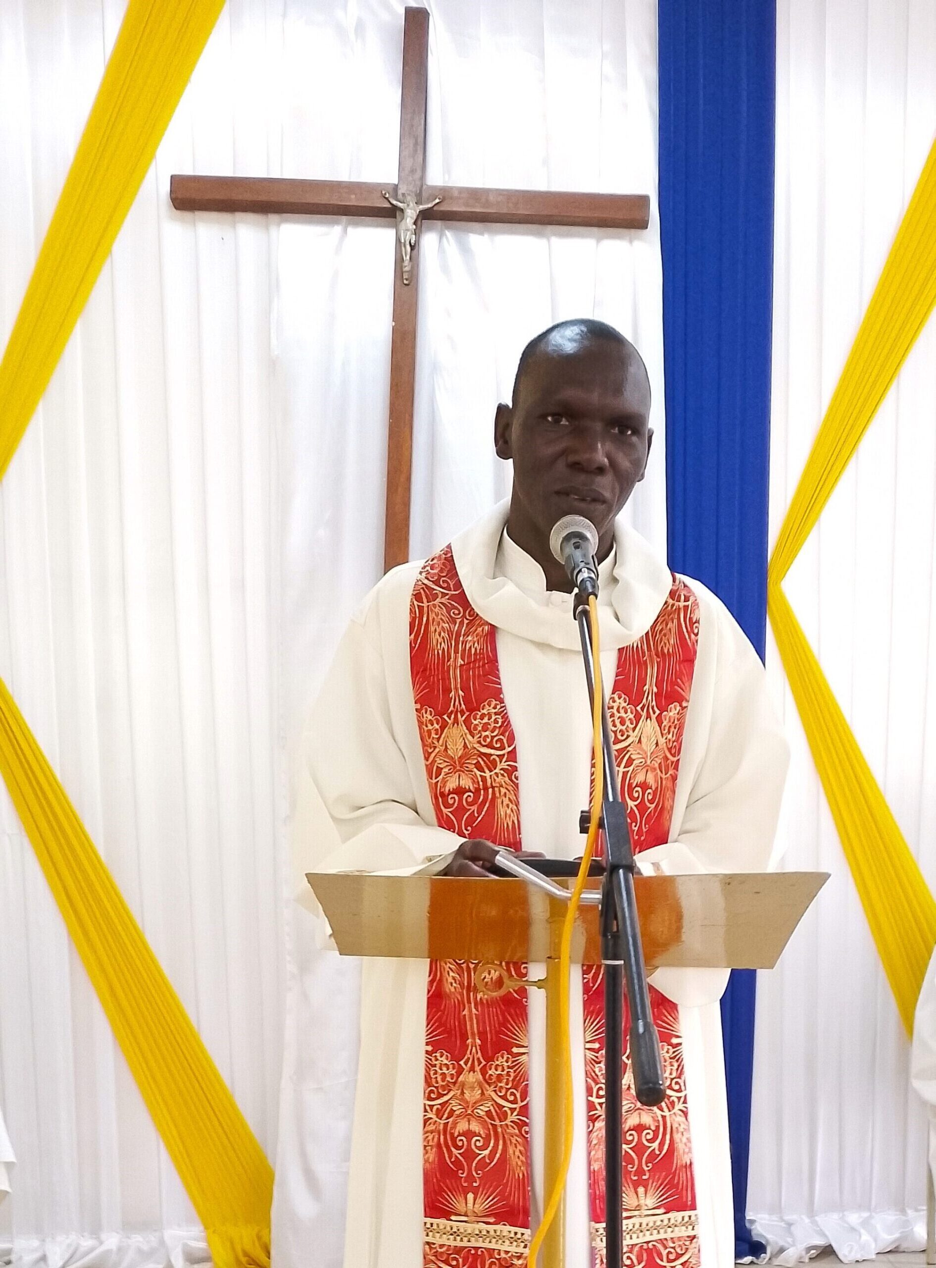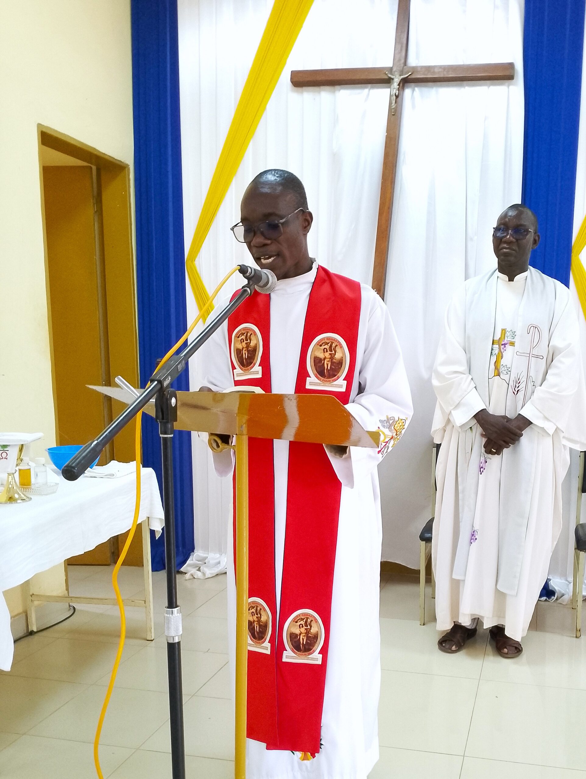 L’Abbé Romaric OUEDRAOGO lors son homélie avec à l’arrière plan l’Aumonier de l’hôpital, l’Abbé François de Sales NARE