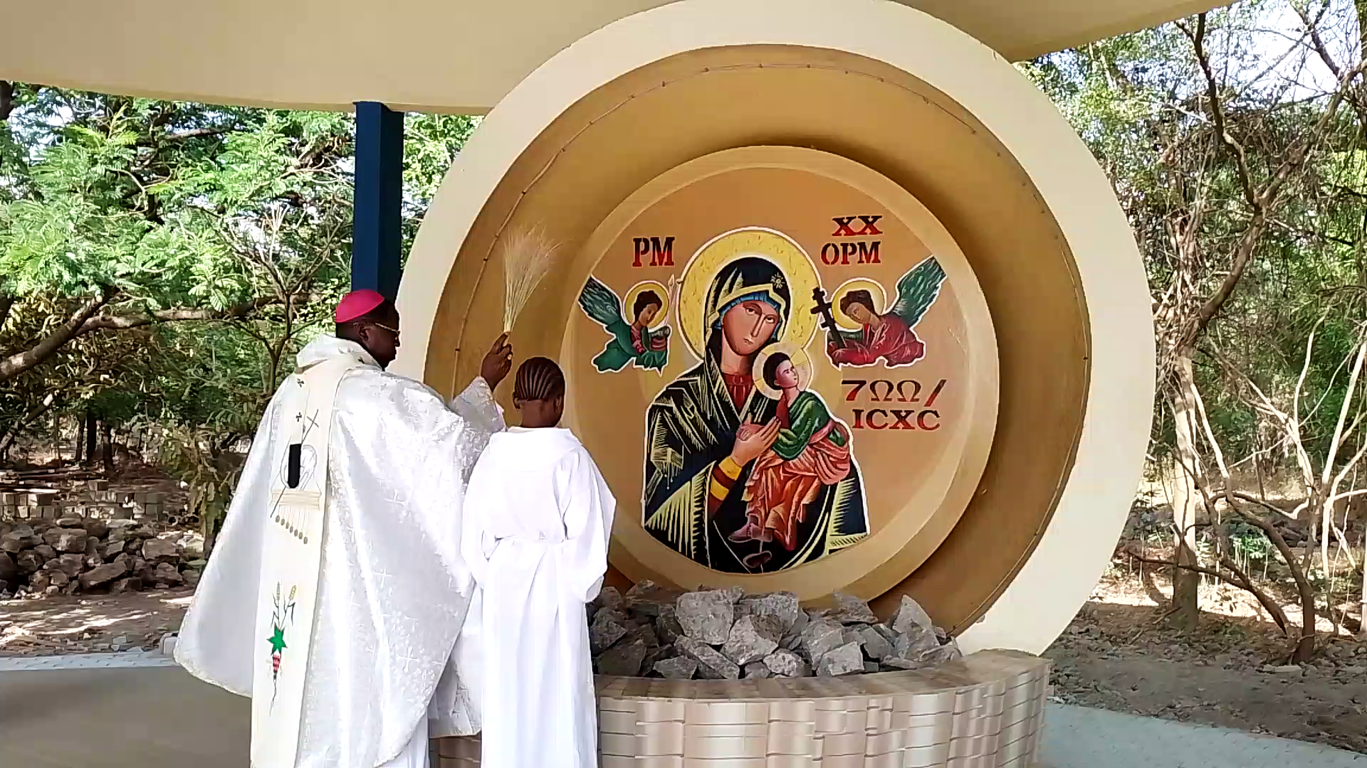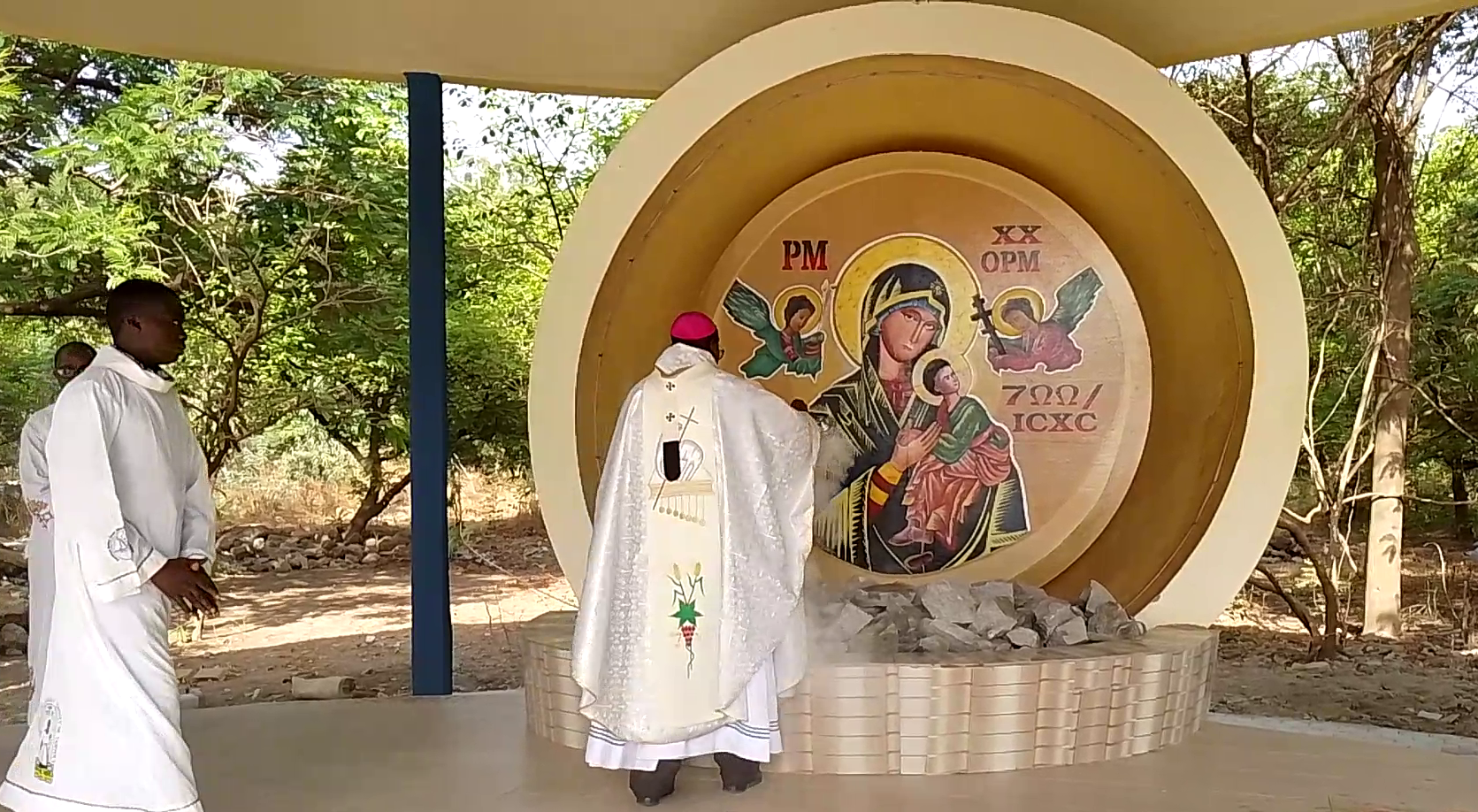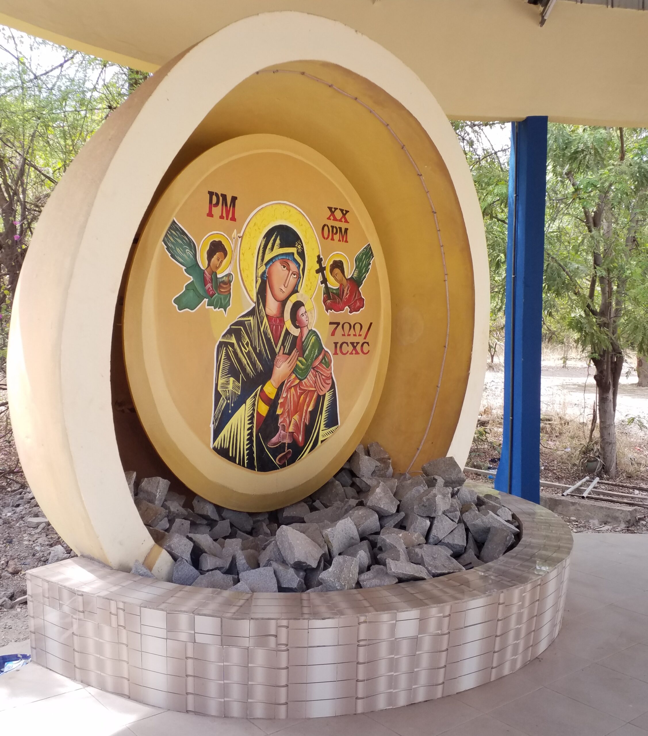 La tente à Marie qui est surélevée du sol avec cinq formes de calebasses visibles à moitié ou entièrement est entourée de poteaux en béton armé recouvert d’un toit doré avec la croix sur la cime. Les grandes formes des deux calebasses où trône l’icone de Notre Dame du Perpétuel Secours sont placées sur un socle en béton armé également, et surplombant la Terrace destinée à accueillir les priants.