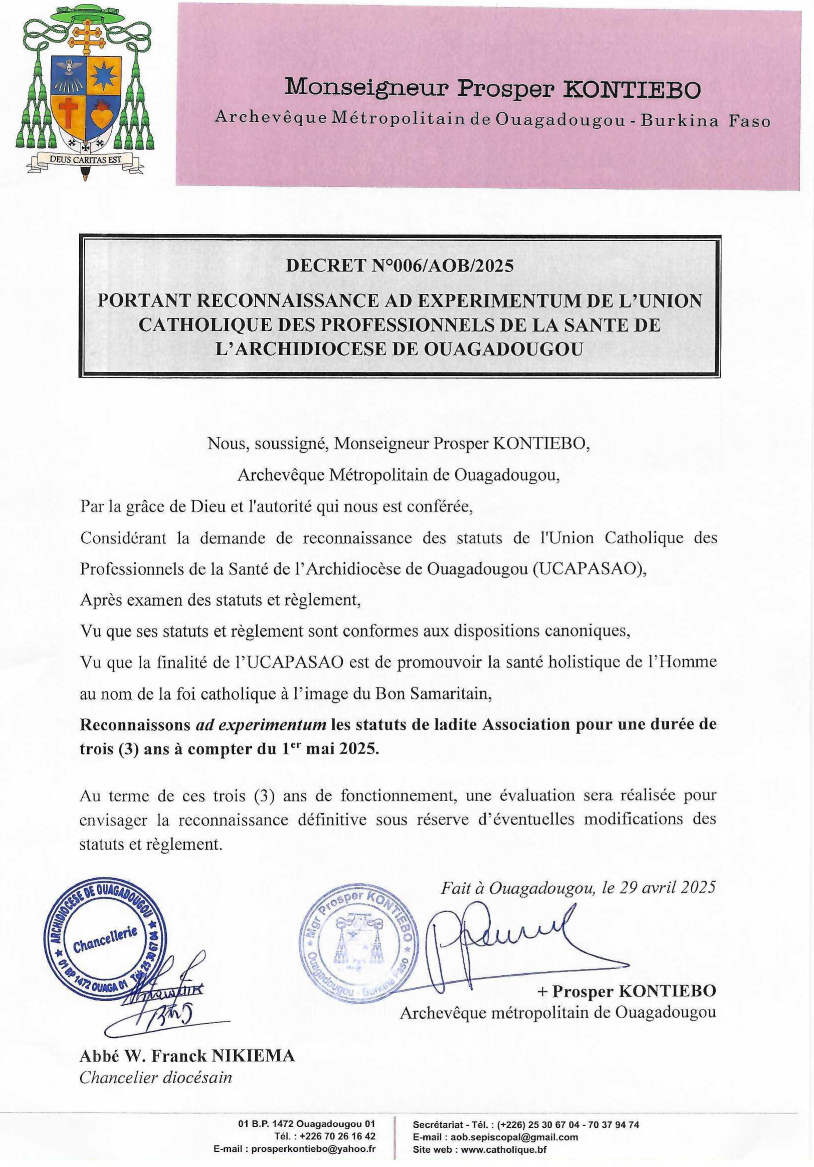 Les statuts de l’Union Catholique des professionnels de la santé bénéficient du soutien de Monseigneur KONTIEBO, Archevêque Métropolitain de Ouagadougou pour une période expérimentale de 3 ans, à travers le décret ci-dessous :